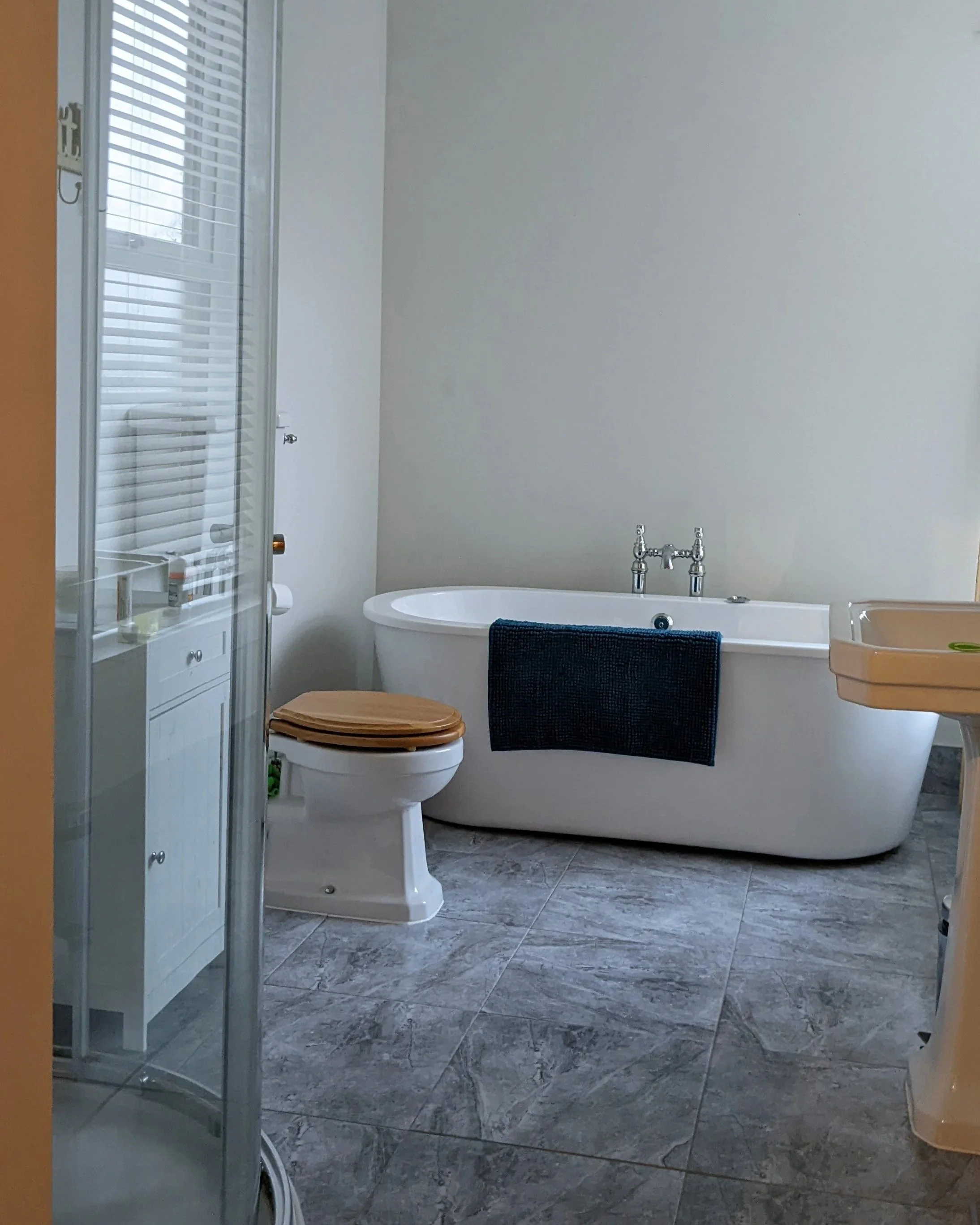 Although there's the obvious saving on labour costs, even a DIY bathroom renovation can cost a lot of money but the existing bathroom here was in really good condition. The traditional style of the plumbing fixtures really suit the style of the house - I liked the wood tones of the toilet seat and I loved the shape of the bath. Ceramic tiles are a great option for bathroom flooring so we also decided to keep the existing grey tile floor and work with the existing marble effect shower tiles.