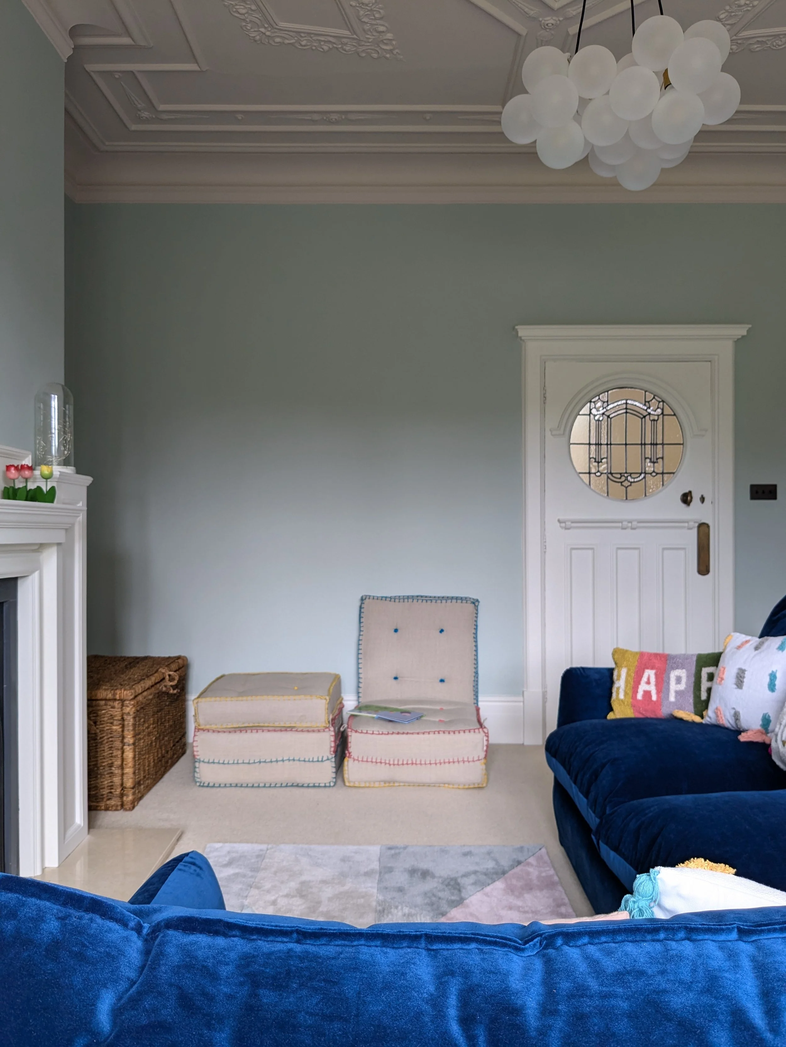 I wanted to create a light and airy feel in this kids' room, so we went with a soft pastel colour scheme. For paint colours, I chose Salix by Little Greene for the playroom walls - a beautifully gentle shade of green that feels fresh and calming. To highlight the decorative ceiling in a subtle way, we used Threadneedle by Mylands, a delicate blush pink that adds just the right amount of warmth without drawing too much attention (this is one of my favourite pink paint shades that works brilliantly in any room, including tricky north facing spaces).