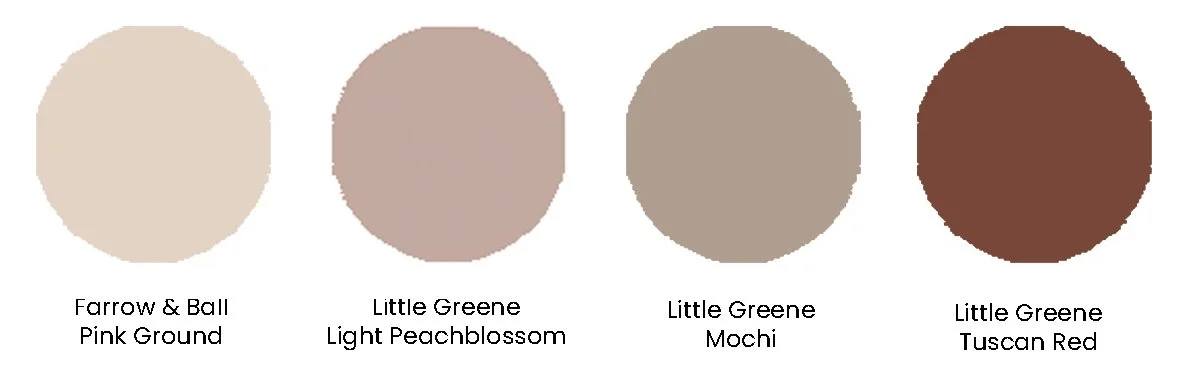Pink Ground (Farrow & Ball) - a soft, muted pink with warm, earthy undertones. In east-facing rooms, the morning light enhances its gentle glow, making it feel both cheerful and calming. It's more muted later in the day but still feels uplifting.