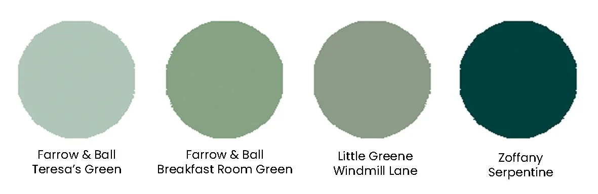Breakfast Room Green (Farrow and Ball) - A cheerful, mid-tone green, evoking the freshness and optimism of early mornings. Named after traditional breakfast rooms which were usually east facing, it maintains a lively feel at all times of day.