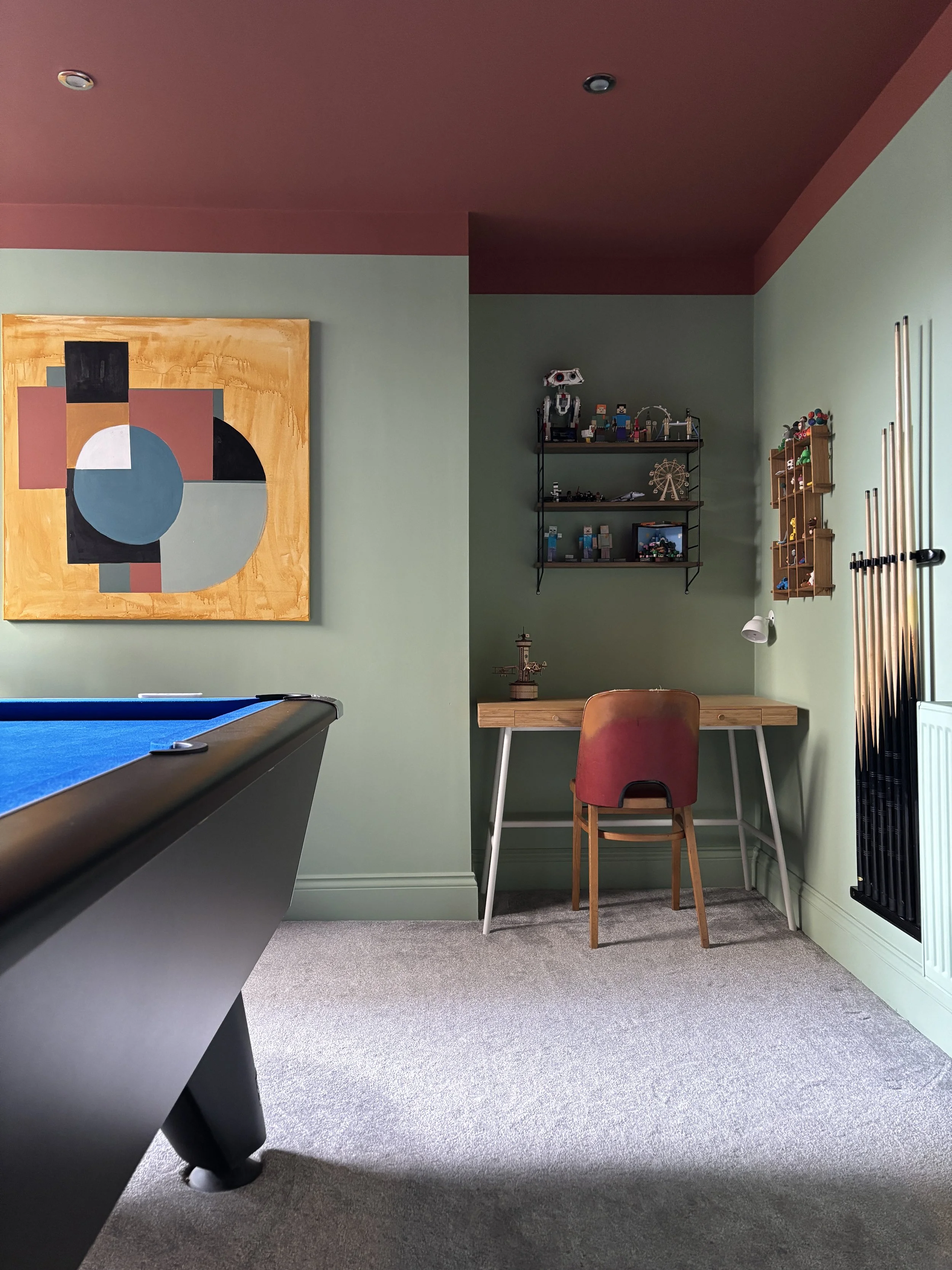 Our games room with walls in Pea Green and ceiling in Tuscan Red