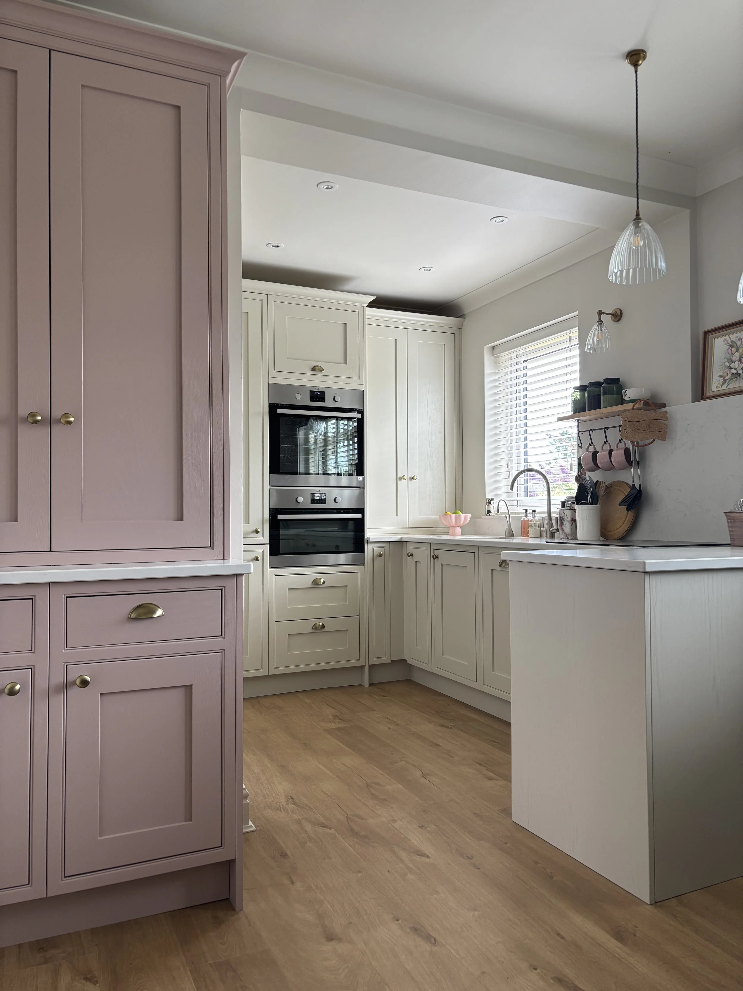 East facing kitchen, with pantry unit in Light Peachblossom. Walls & ceiling in Portland Stone Light
